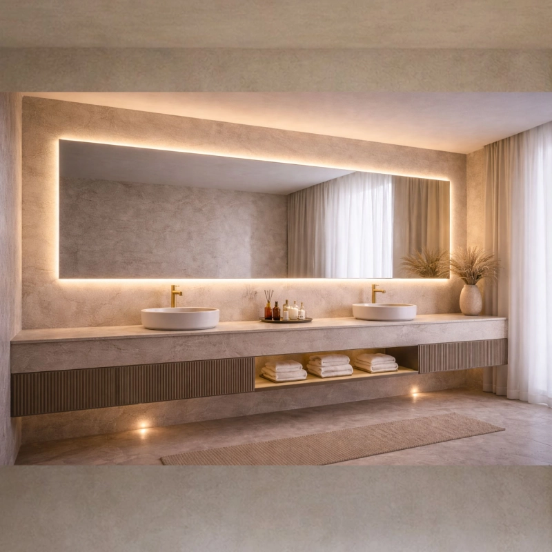 Eleganckie lustro VALO SLIM LED, z subtelnym podświetleniem stanie się ozdobą niejednego pomieszczenia. Prosta forma wykończona delikatną metalową ramą oraz rozporoszone światło sprawdzi się nie tylko w łazience. Lustro LED nadaje wnętrzu przytulności, dzięki braku konieczności instalowania dodatkowego oświetlenia pozwala na zachowanie we wnętrzu minimalistycznego, eleganckiego stylu. VALO SLIM LED będzie idealnym dopełnieniem między innymi łazienki w stylu nowoczesnym, japandi, loftowym czy skandynawskim.