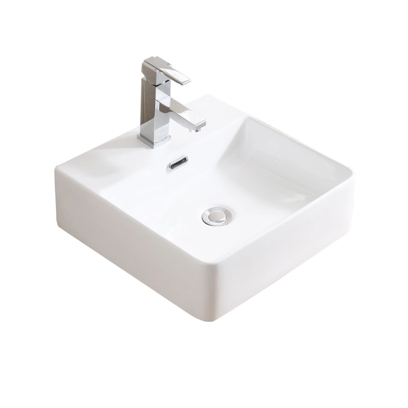 Umywalka nablatowa / wisząca kwadratowa biała z otworem i z półką na mydło 42 x 42 cm SANYA z cienkim rantem typu Slim