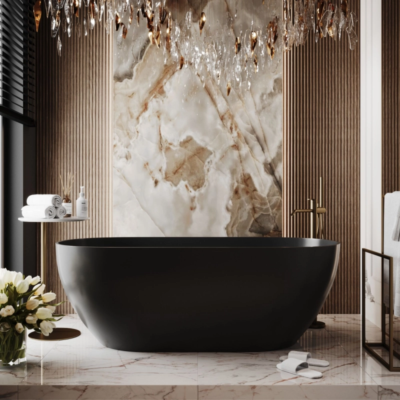 Wanna wolnostojąca owalna czarna matowa z konglomeratu 160 x 75 cm VENE BLACK MATT przelew typu SLIM cienki rant