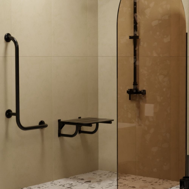 Siedzisko prysznicowe z kolekcji COMFORT przeznaczone jest dla osób starszych, z dysfunkcją ruchu oraz dla osób niepełnosprawnych. Krzesełko posiada opcję złożenia, dzięki czemu nie zajmuje wiele miejsca. Wykonane z czarnej listwy PCV siedzisko jest antypoślizgowe, łatwe do utrzymania w czystości oraz przyjemne w dotyku.