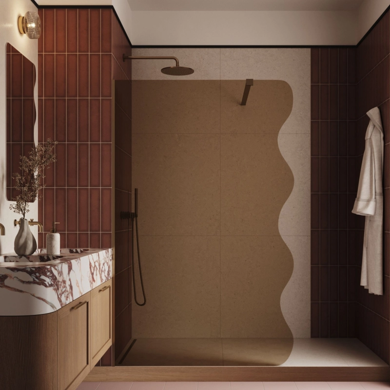 1. Kształt inspirowany falą – niebanalna linia szkła, która zamienia prysznic w designerską przestrzeń.