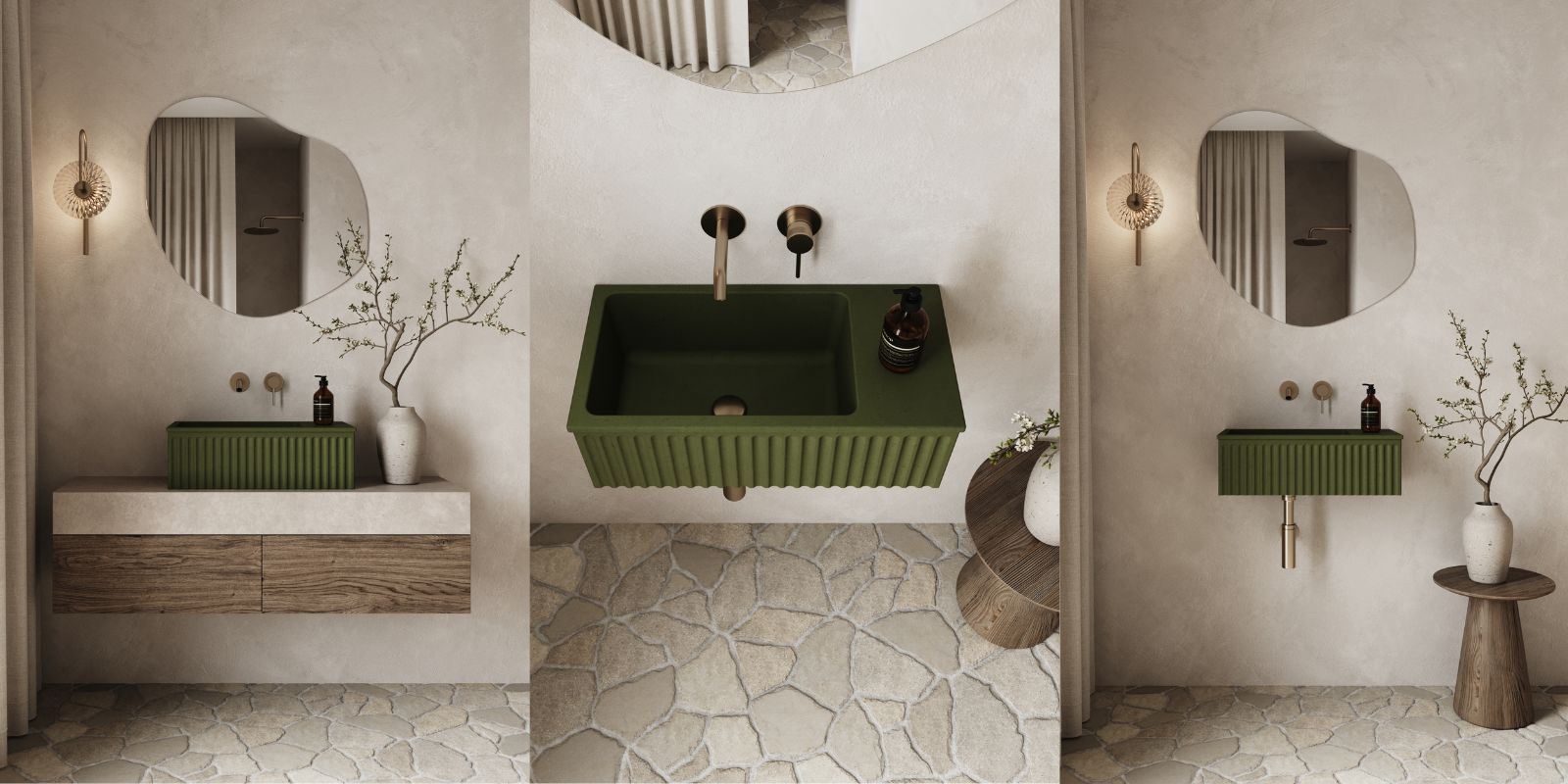 Odkryj betonową umywalkę WELLE z dekoracyjnym ryflowaniem oraz lustro MERINGO o organicznym, nieregularnym kształcie. Stylowy zestaw do nowoczesnej łazienki w wielu kolorach.