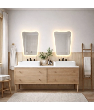 Odkryj wyjątkową atmosferę w swojej łazience dzięki lustrze podświetlanemu MISTRAL LED o nieregularnym kształcie - najnowszy hit w aranżacji wnętrzowych! Jeśli szukasz funkcjonalnego rozwiązania do zagospodarowania przestrzeni w swojej łazience, to trafiłeś we właściwe miejsce. Nasze lustro MISTRAL z podświetleniem LED wyróżnia się oryginalnym, nieregularnym kształtem, co nadaje mu wyjątkowego charakteru. Bezramowa konstrukcja lustra umożliwia dopasowanie do każdej kolorystyki wnętrza, zapewniając doskonałe uzupełnienie Twojej stylowej łazienki lub pokoju. Dzięki podświetleniu LED na całym obwodzie oraz neutralnej barwie światła, zapewnia ono przyjemną atmosferę i komfort korzystania. Zapewnij sobie niepowtarzalny urok i nowoczesność w swojej łazience dzięki lustrze MISTRAL LED.