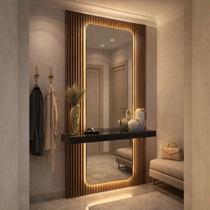 Zintegrowane podświetlenie LED subtelnie otacza lustro, tworząc miękką, równomierną poświatę, która buduje klimat i podkreśla architekturę wnętrza. W formacie XXL światło zyskuje dodatkowy wymiar – nie tylko doświetla przestrzeń, ale staje się jej integralnym elementem dekoracyjnym. Lustro optycznie powiększa pomieszczenie, dodając mu głębi i nowoczesnej elegancji.