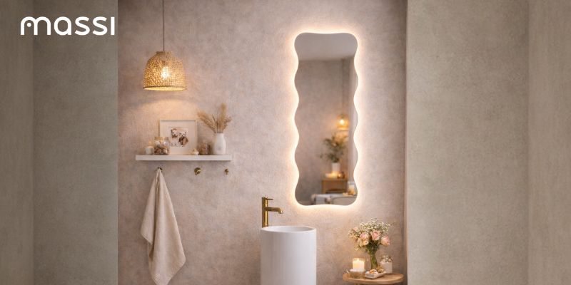 Delikatnie falowana krawędź tafli, inspirowana naturalnym ruchem wody, wprowadza miękkość i harmonię, jednocześnie nie dominując aranżacji. To idealny wybór do łazienek, stref umywalkowych, korytarzy oraz wnętrz typu premium, gdzie liczy się wysmakowana forma i funkcjonalność w jednym.