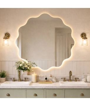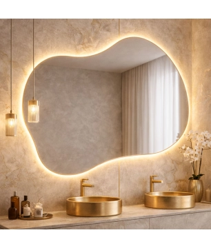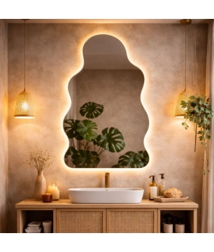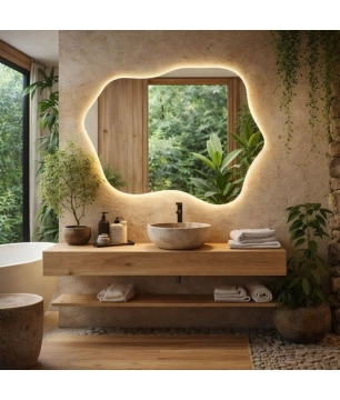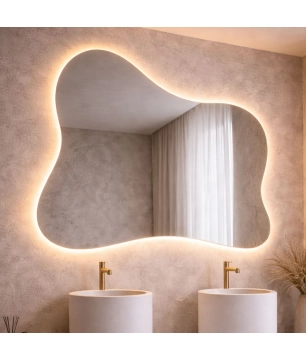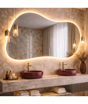 Nasz wyjątkowy model lustra MERINGO to idealne uzupełnienie Twojej łazienki. Nieregularny kształt nadaje pomieszczeniu oryginalnego charakteru, stanowiąc zarazem centralny element aranżacyjny. Bezramowa konstrukcja dodaje mu nowoczesnego uroku, jednocześnie sprawiając, że łatwo dopasuje się do różnorodnych stylów wnętrzarskich. To również doskonałe rozwiązanie dla tych, którzy posiadają dodatkowe źródło światła lub preferują lustra bez podświetlenia, zachowując jednocześnie elegancki minimalizm. Dzięki lustrom MERINGO Twoja łazienka zyska niepowtarzalny i elegancki wygląd, który przyciągnie wzrok każdego, kto wejdzie do tego pomieszczenia.