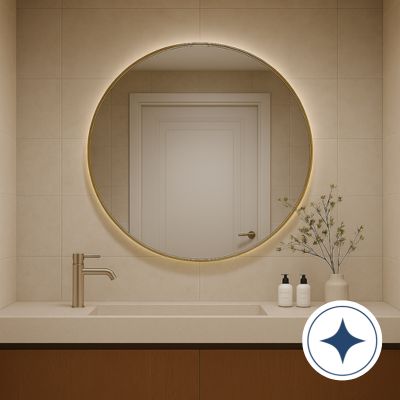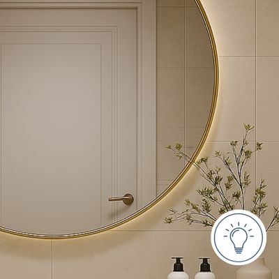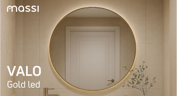 Lustro VALO, dzięki swemu okrągłemu kształtowi, stanowi doskonałe uzupełnienie każdego pomieszczenia, bez względu na jego styl – czy to nowoczesny, czy klasyczny. Jednak to złota rama nadaje mu niepowtarzalnego charakteru, dodając elegancji i wytworności. Złoto doskonale komponuje się z różnymi aranżacjami wnętrz, nadając im luksusowego wykończenia. Dodatkowo, podświetlenie sprawia, że lustro nie tylko oświetla przestrzeń, ale również dodaje jej subtelnego blasku i wyjątkowego uroku, co czyni łazienkę jeszcze bardziej wyjątkową i przyjemną dla oka.