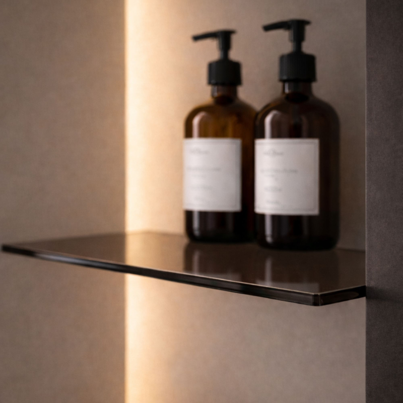 Półka wnękowa MOLIS 20x20 cm to szklana półka prysznicowa zaprojektowana z myślą o uporządkowaniu przestrzeni w strefie mokrej bez wprowadzania wizualnego ciężaru. Wykonana z hartowanego szkła o grubości 8 mm, zapewnia stabilność oraz odporność na wilgoć i codzienne użytkowanie. Format 20x20 cm pozwala na wygodne przechowywanie podstawowych kosmetyków, jednocześnie zachowując kompaktowy wymiar, który sprawdza się zarówno w małych kabinach prysznicowych, jak i większych strefach walk-in.