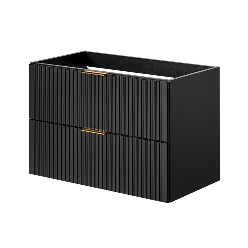 Odkryj szafkę pod umywalkę ASTROS, która z modnymi ryflowanymi frontami i systemem cichego zamykania wprowadza nowoczesność i elegancję do każdej łazienki. Ryflowane fronty nie tylko przyciągają wzrok, ale również przełamują monotonię, nadając szafce wyjątkowej głębi. Szafka w klasycznym czarnym odcieniu to idealne tło dla różnorodnych aranżacji – od klasycznych, przez glamour, po loftowe. Zapewnia nie tylko funkcjonalność, ale i dodaje stylowego charakteru każdej łazience. Co więcej, szafka ASTROS jest bez blatu, dając wolność w kreowaniu własnej łazienki. Wybierz idealny blat z naszej oferty, aby stworzyć spersonalizowaną i spójną aranżację, która odpowiada Twoim oczekiwaniom estetycznym i funkcjonalnym. Dodatkowo, przestronne wnętrze z dwoma szufladami umożliwia efektywne przechowywanie akcesoriów łazienkowych, zapewniając porządek i łatwy dostęp. Wybierz szafkę ASTROS i ciesz się przestrzenią, która łączy w sobie funkcjonalność z niezwykłym pięknem nowoczesnych mebli, stając się oazą relaksu i luksusu w Twoim domu.