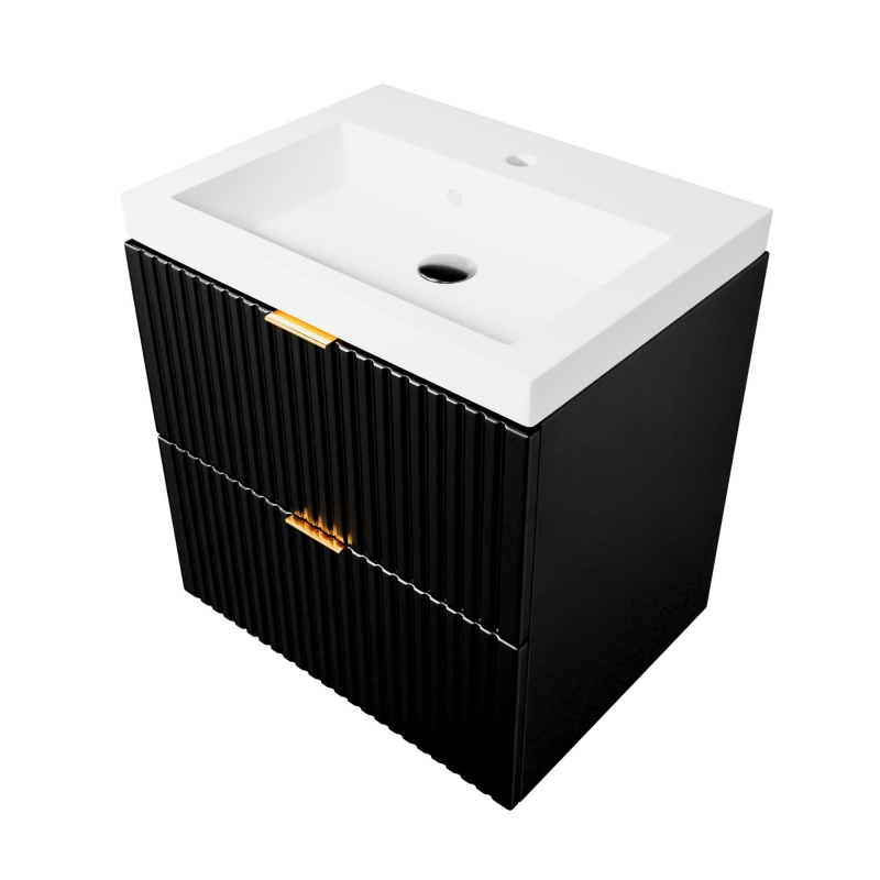 Oto szafka z umywalką ASTROS - doskonałe połączenie nowoczesnego designu i funkcjonalności. Charakteryzuje się modnymi frezowanymi frontami, cichym domykaniem i jest dostępna w matowej czerni, co nadaje wnętrzu nowoczesny, a zarazem luksusowy charakter. W komplecie znajdują się do wyboru trzy kolory uchwytów: czarny, złoty, chromowany, pozwalające na indywidualne dopasowanie do stylu łazienki. W zestawie z białą umywalką KLAR z konglomeratu, szafka tworzy spójną, estetyczną całość. Dzięki dwóm przestronnym szufladom, zapewnia wygodne przechowywanie akcesoriów łazienkowych. Inwestując w szafkę ASTROS, zyskujesz nie tylko miejsce przechowywania, ale również wyjątkowy element dekoracyjny, który zamieni każdą łazienkę w przestrzeń relaksu i luksusu.