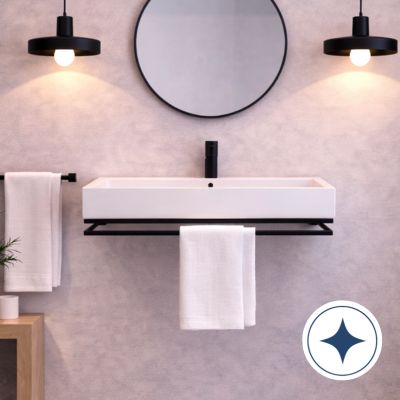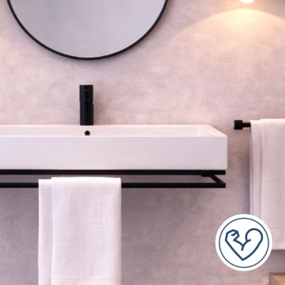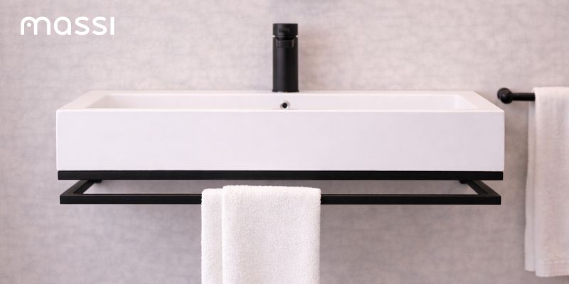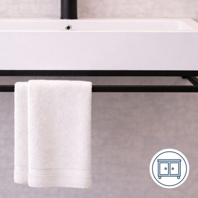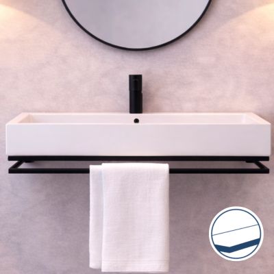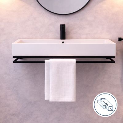 Czarna konsola NAVI Lift posiada wbudowany uchwyt na ręcznik, który stanowi część metalowej konstrukcji. Dzięki temu ręcznik znajduje się zawsze w zasięgu ręki, a strefa umywalkowa pozostaje uporządkowana.