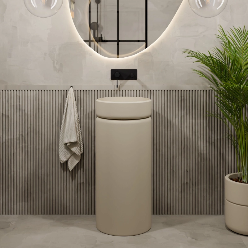 Umywalka z konglomeratu wolnostojąca okrągła beżowa matowa 85 x 40 cm RONA Beige Matt