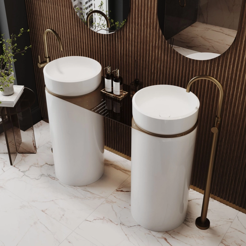 Zestaw dwóch umywalek RONA połączonych szklaną półką to wyraz współczesnego podejścia do projektowania łazienki – gdzie forma, detal i funkcjonalność tworzą harmonijną całość. Umywalki zbudowane z dwóch wyraźnie oddzielonych elementów – masywnego postumentu i eleganckiej, okrągłej misy – tworzą bryłę, która staje się centralnym punktem każdej łazienki. Najbardziej wyjątkowym elementem zestawu jest owalna, hartowana półka szklana, która lekko i niemal niewidocznie łączy obie umywalki. Wprowadza efekt zawieszenia, dzięki któremu całość zyskuje wizualną lekkość i nowoczesny akcent, przełamując masywną formę postumentów subtelnym detalem. Ta designerska pólka nie tylko przyciąga wzrok, ale też dodaje charakteru i indywidualności całemu zestawowi. To połączenie, które łączy funkcjonalność z wyszukaną estetyką – w idealnej równowadze.