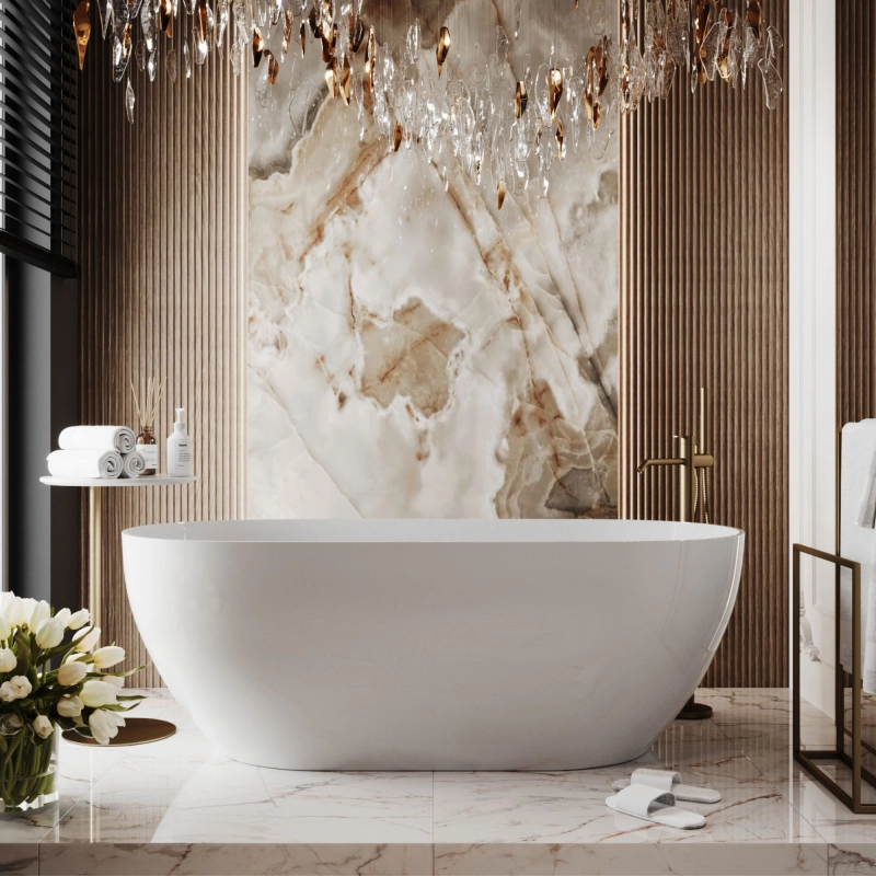 Wanna wolnostojąca owalna z konglomeratu 160 x 75 cm RONA White mat / połysk przelew typu SLIM cienki rant