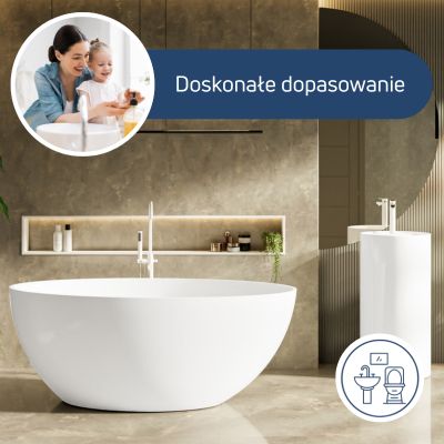 - Komfort i relaks: Ergonomiczne kształty wanny i umywalki zostały zaprojektowane z myślą o wygodzie użytkowania. Wanna zapewnia relaksującą kąpiel, tworząc idealne miejsce do odprężenia po długim dniu, a umywalka wygodę codziennego użytku,